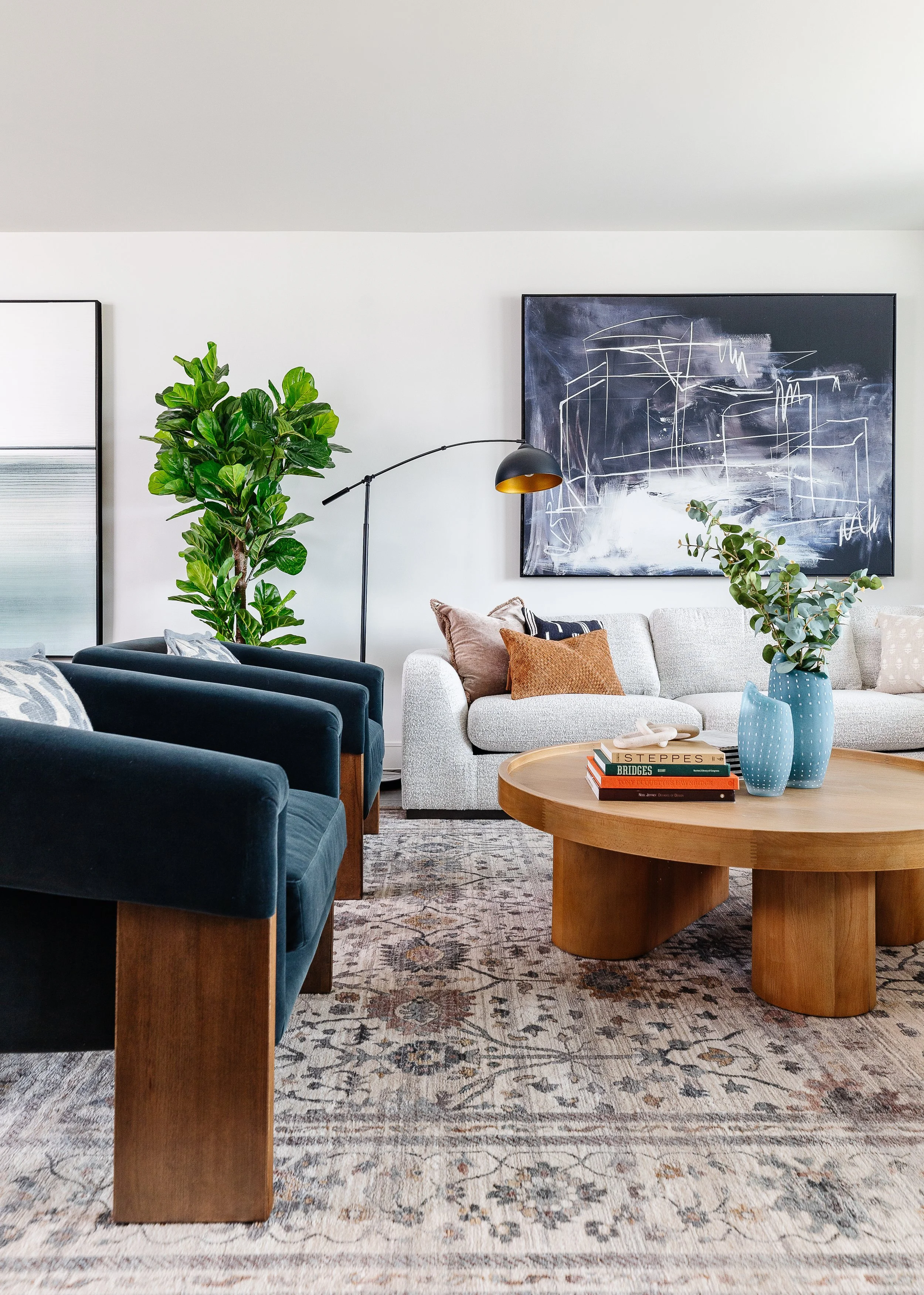 Next, focus on the coffee table and side tables. A round coffee table is easiest to fit in most seating arrangements.