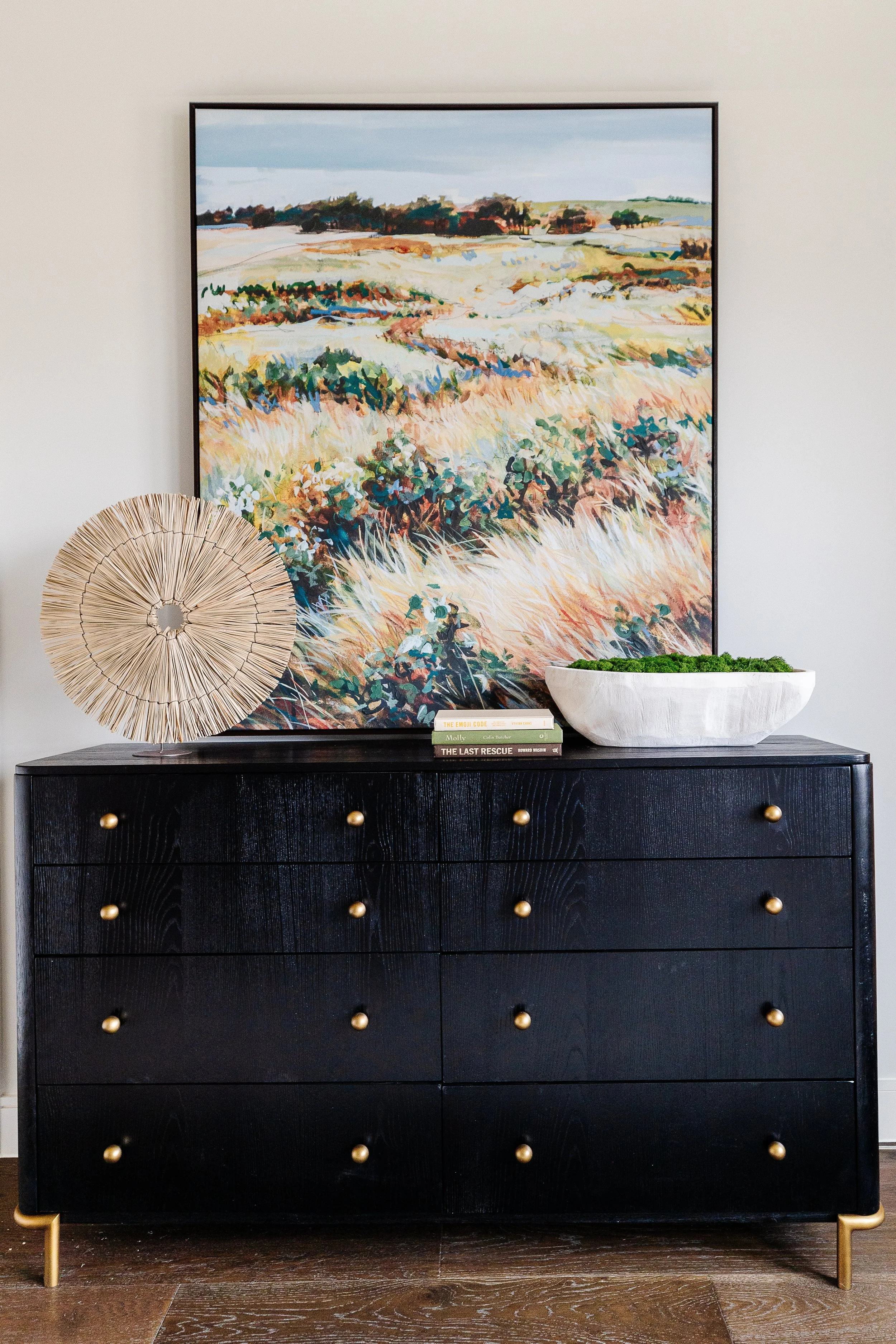 Dresser: A dark wood dresser with brass handles for a chic look. Again, avoid matching the wood tone of the nightstands.
