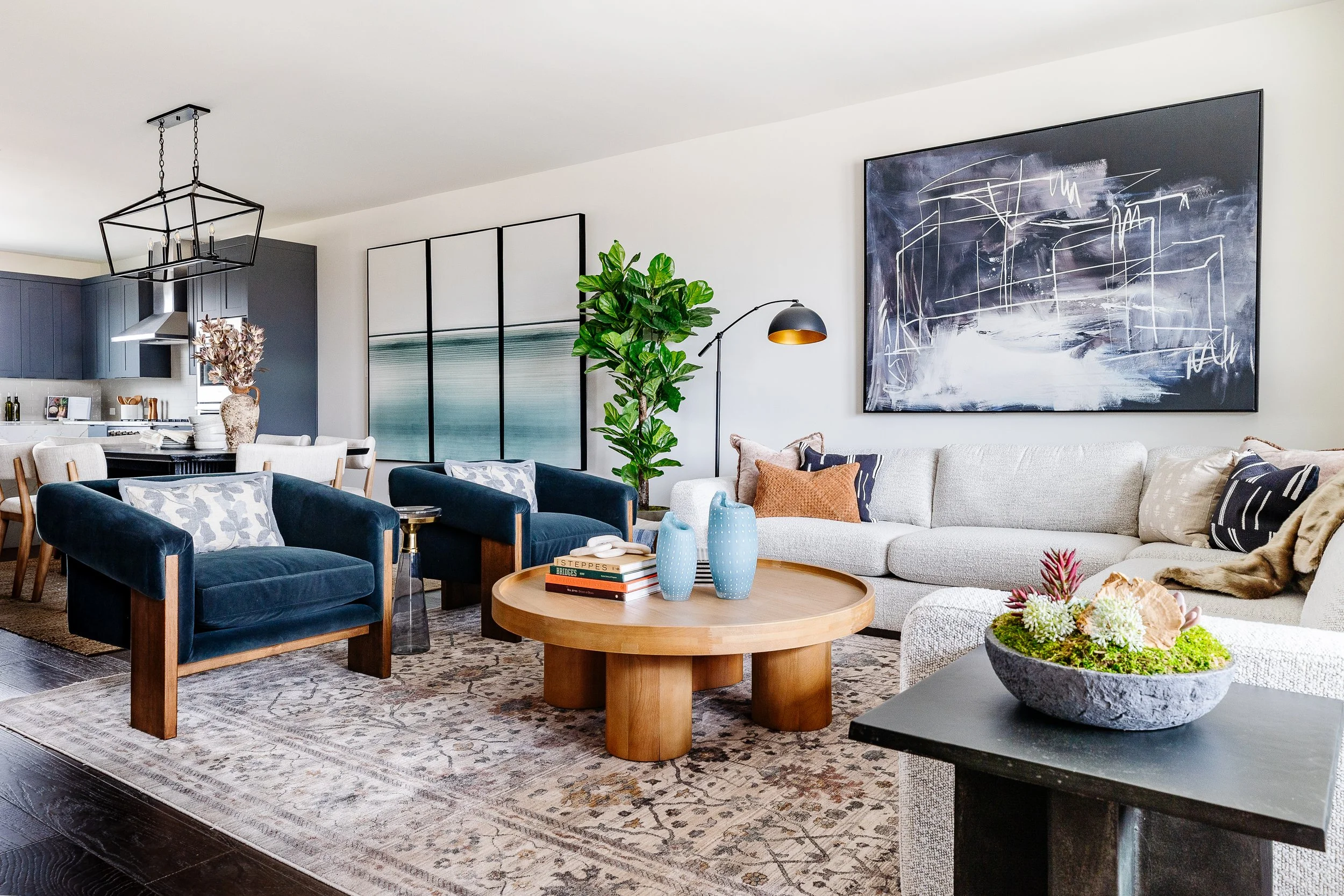 The living room is often the first space people notice when they step inside a home, so make it irresistible! Our go-to formula combines large-scale art with a gorgeous area rug to instantly elevate the space. Layer in textures through pillows, blankets, and accessories to create a high-design feel that’s welcoming and approachable. The best part is that this look is entirely achievable on your own and can help boost appeal—and sales—at any property.